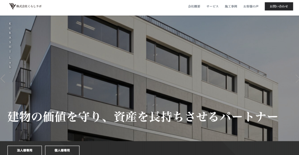 株式会社くらしラボに見られるシックなデザインは、信頼性と専門性を求める法人経営者に対して、強力なブランドメッセージとして機能し、確実な問い合わせへと導きます。
